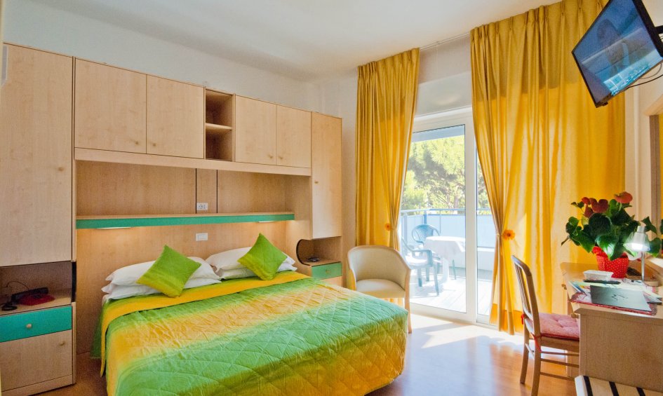 Stanza doppia/matrimoniale, con ampio balcone con vista sud, sud-ovest, TV Sat, radio, telefono, frigobar vuoto o a richiesta pieno, cassetta di sicurezza, aria condizionata, connessione internet Wi-Fi, servizi completi con box doccia, bidet e asciugacapelli.