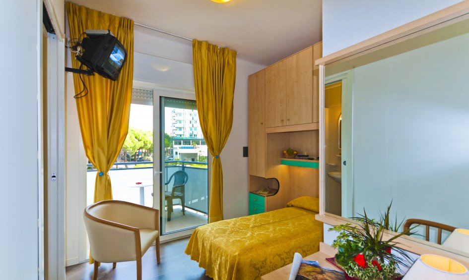 Einzelzimmer mit großem Balkon, Sat-TV, Radio, Telefon, Kühlschrank, Safe, Klimaanlage, WLAN-Internetzugang, Badezimmer mit Dusche, Bidet und Haartrockner.