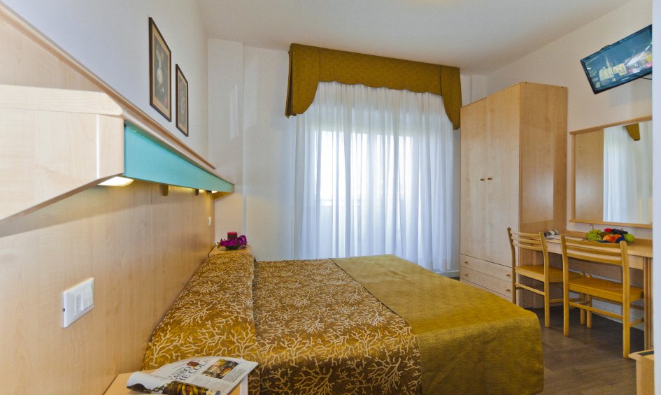 Komfortable Doppelzimmer im 4. Stock mit großem Balkon mit Meerblick (Süd-Süd-Seite), Sat-TV, Radio, Telefon, Kühlschrank, Safe, Klimaanlage, WLAN-Internetzugang, Badezimmer mit Dusche, Bidet und Haartrockner.